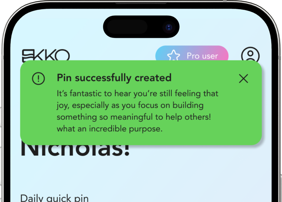 Ekko identifies the common threads woven through your daily pins to reveal the patterns that define your experiences. By surfacing these hidden connections, it helps you recognize consistent emotional cycles and the underlying thoughts that influence your long-term growth.