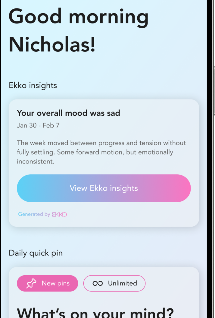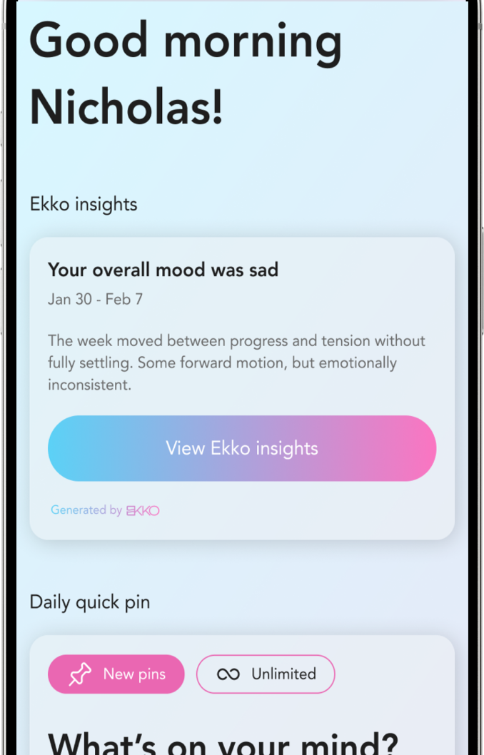 Ekko transforms your daily pins into a high-definition portrait of your emotional journey. It clears the mental noise to surface your true "Weekly Vibe," helping you distinguish between being pressured and being truly focused.